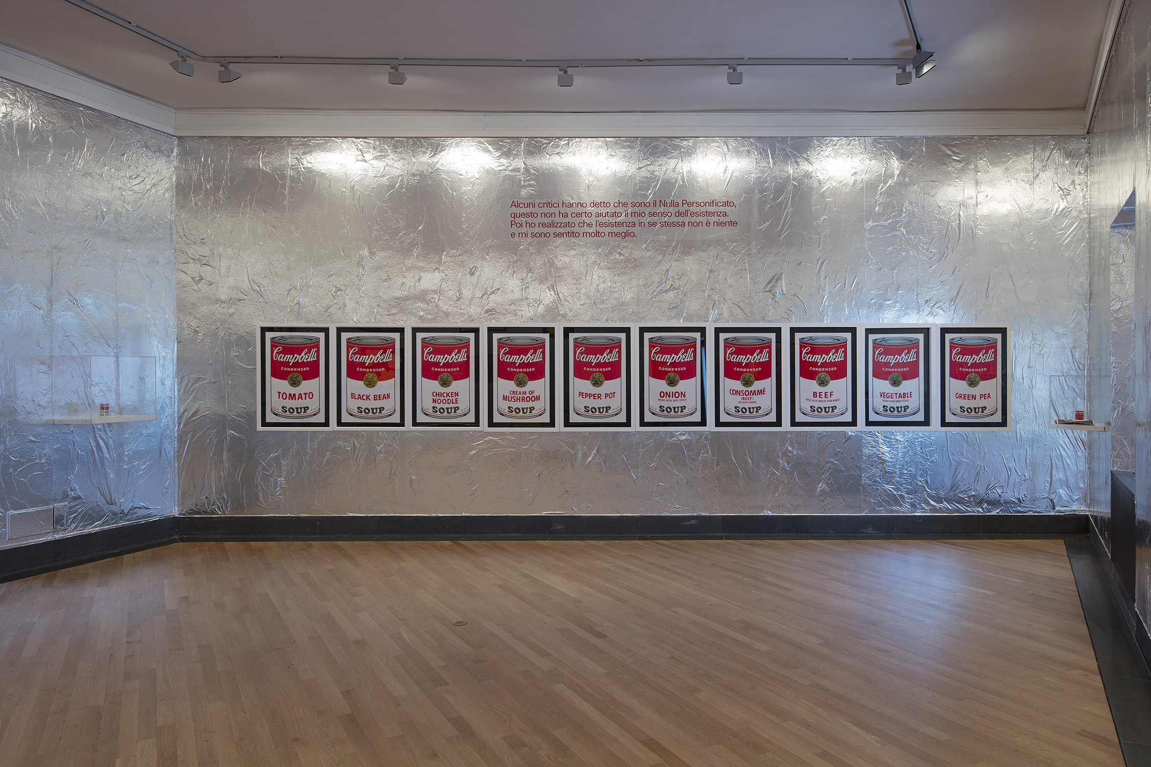 Le quattro sale in cui si snoda il percorso espositivo sono foderate di carta argentata come nella celebre Factory, il suo studio-laboratorio newyorkese, e accolgono opere eterogenee che restituiscono allo spettatore la personalità originale e unica di Warhol, toccando i molteplici campi espressivi sperimentati dall’artista: dipinti e opere su carta, serigrafie, film, fotografie, copertine di dischi e riviste accanto a oggetti personali (gli stivali che ha indossato mentre lavorava alle opere prodotte in occasione della storica mostra del 1980 da Lucio Amelio) e documenti fotografici.
