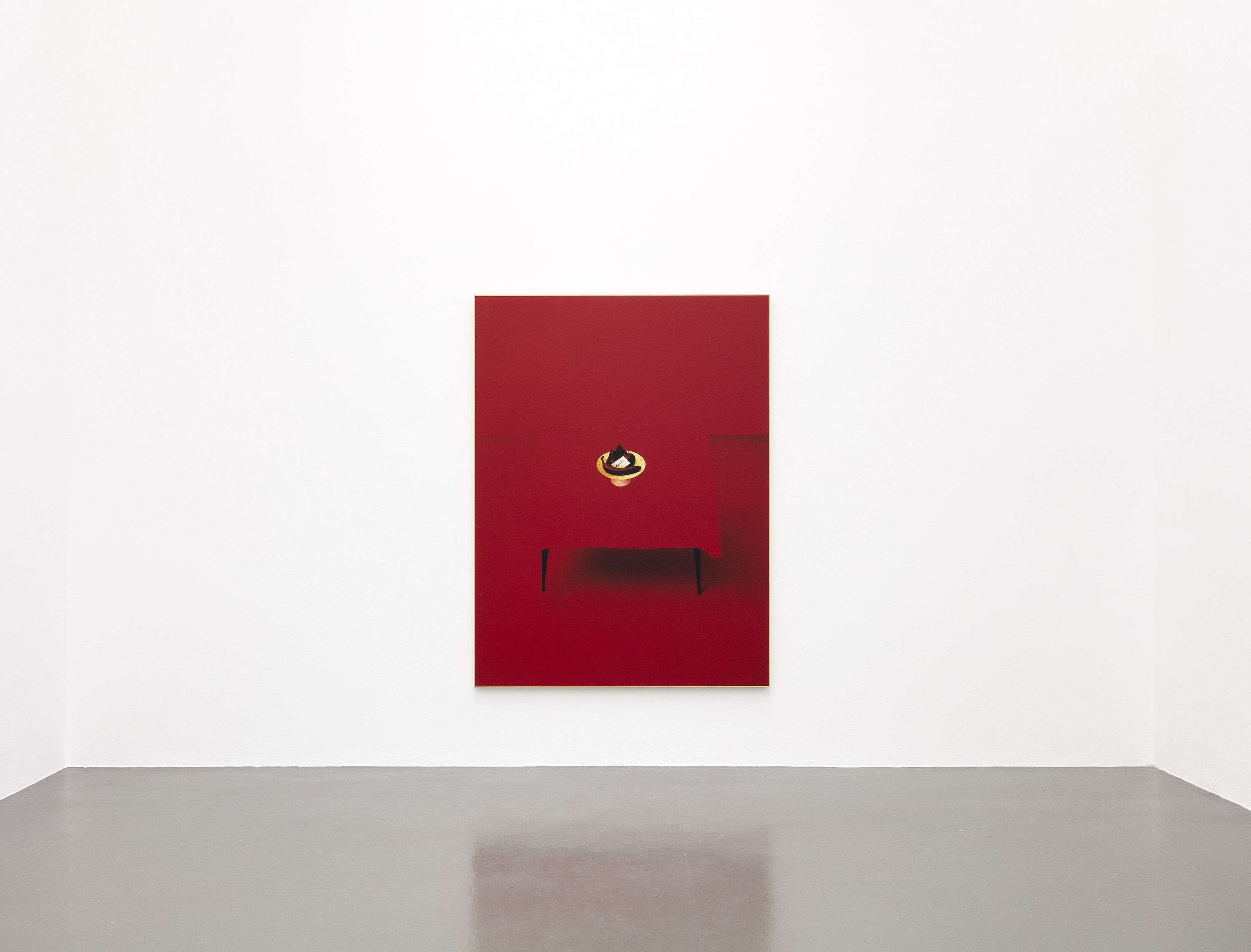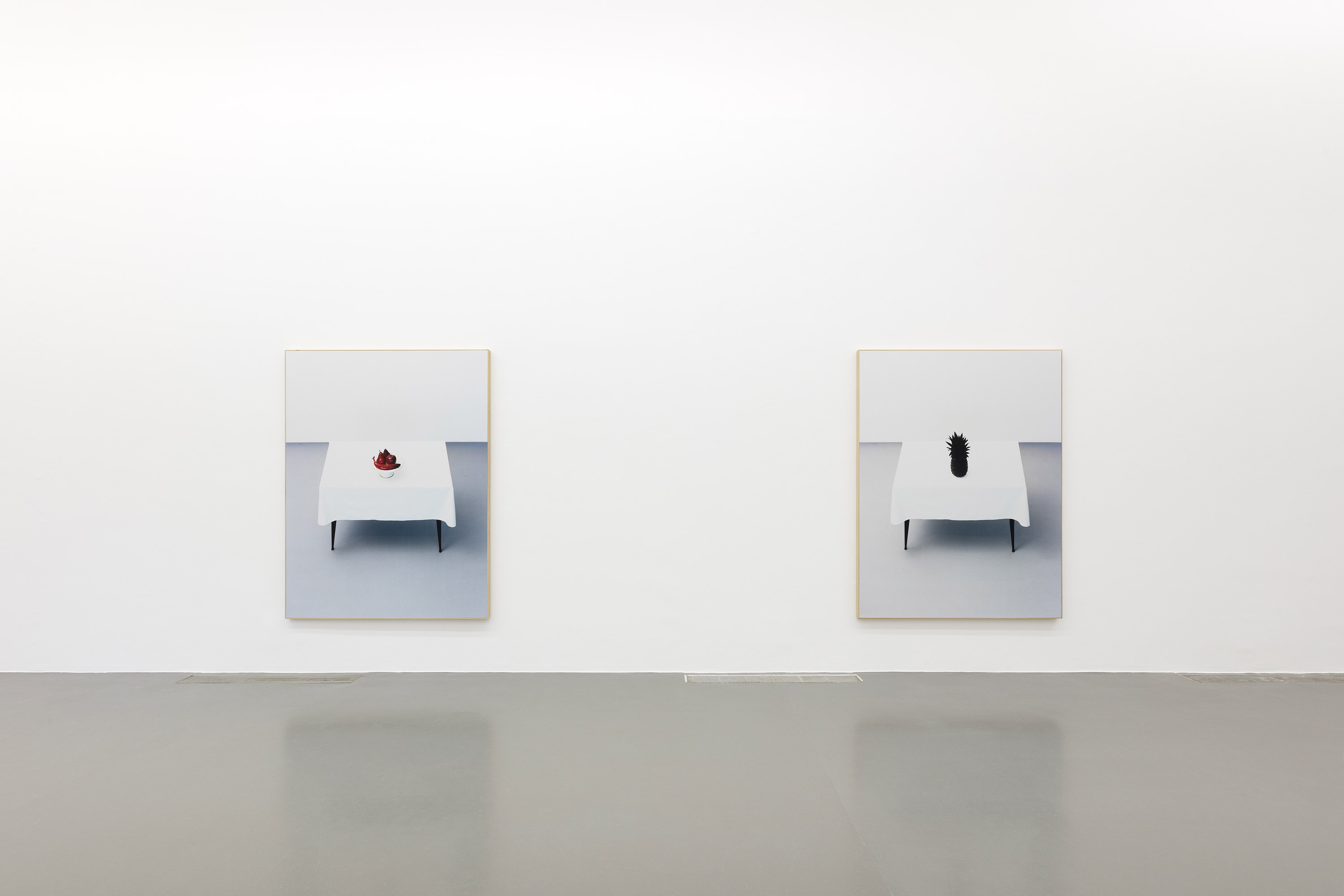 Il percorso continua con l’esposizione di due dittici: nel primo (cm 63×58) viene rappresentato un biscotto dechirichiano appoggiato su una tovaglia bianca, al limite del tavolo. Il gioco pittorico delle sfumature di colore si spinge fino a rendere ambigua la distinzione tra fotografia e pittura. La composizione si regge di volta in volta aggrappandosi alla nota di verde o di rosso della ciliegia che decora il dolce. Nel secondo (cm 68×68), la calma e polverosa sfumatura pittorica delle tazze di porcellana viene turbata dal grido scarlatto di una ciliegia candita, prima solitaria poi in compagnia di un mazzetto di garofani avvolti nell’abbraccio trasparente del nastro adesivo.
