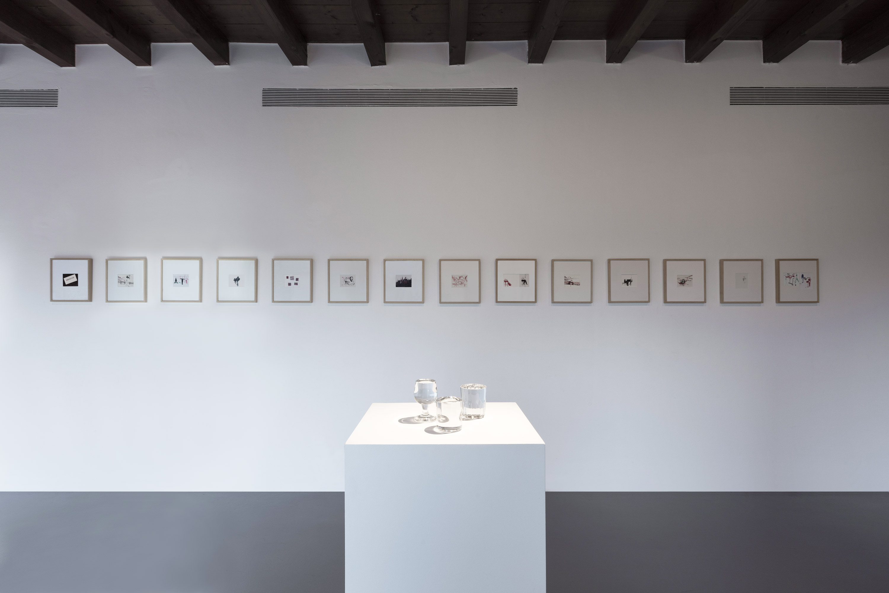 Completano il percorso tre bicchieri in vetro di Murano, scolpiti come fossero bicchieri pieni d’acqua fino all’orlo, e talmente colmi da indurci a avvicinarci con cautela – come fosse impossibile non rovesciarli –, e una serie di disegni realizzati a penna a sfera Bic, nei 4 colori nero, blu, rosso e verde. Il disegno, come la fotografia, è in presa diretta, un segno è definitivo e per sempre, un po’ come accade esponendo i negativi: “una volta impressionati dalla luce” – afferma l’artista – “non si può far altro che accettarli o scartarli in toto”.