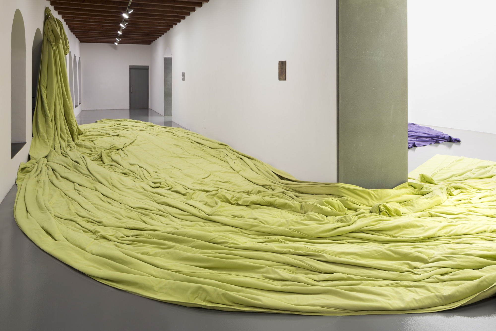 Lo spazio espositivo, inoltre, accoglie un enorme intervento installativo concepito per trasformare l’esperienza percettiva dello spettatore, sollecitando il suo senso tattile oltre che quello visivo.