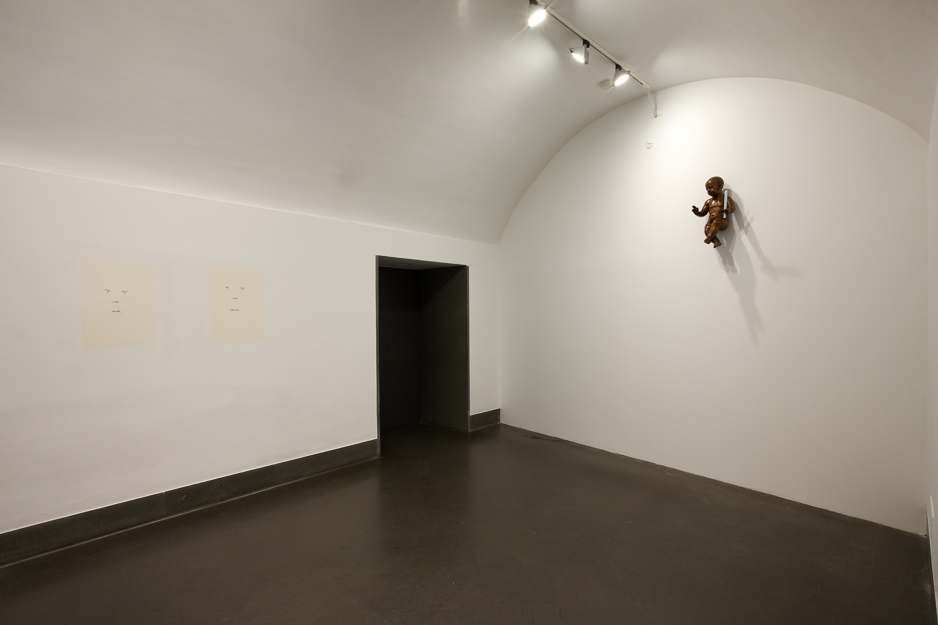 Nella prima sala troviamo due sculture della serie Idiot: Idiot III del 2006 e Idiot V 2007. In entrambi i casi simboli e icone della religiosità sono colti nell’atto di chiudersi in se stessi, in un momento di afasia e di sospensione, come se la propria aura fosse soffusa di perplessità. Nel lavoro di Kris Martin è frequente il ricorso alla figura dostojevskiana dell’idiota come metafora di una condizione esistenziale estrema, cioè quella dell’artista e, più in generale, di una condizione della conoscenza che riguarda tutta l’umanità, colta in un’eterna contraddizione tra illuminazione e fallimento. Di qui il titolo della mostra, quell’Inter pares (“tra i pari” in latino) che richiama l’espressione “Primus inter pares”, a segnalare una condizione di eccezionalità cui, nonostante tutto, non corrisponde un accresciuto potere. In questo senso tra divinità, artista, creazione letteraria e genere umano si crea una forma di solidarietà basata su una forma paradossale di unicità che, se da una parte annuncia la salvezza, dall’altra non è in grado di realizzarla.