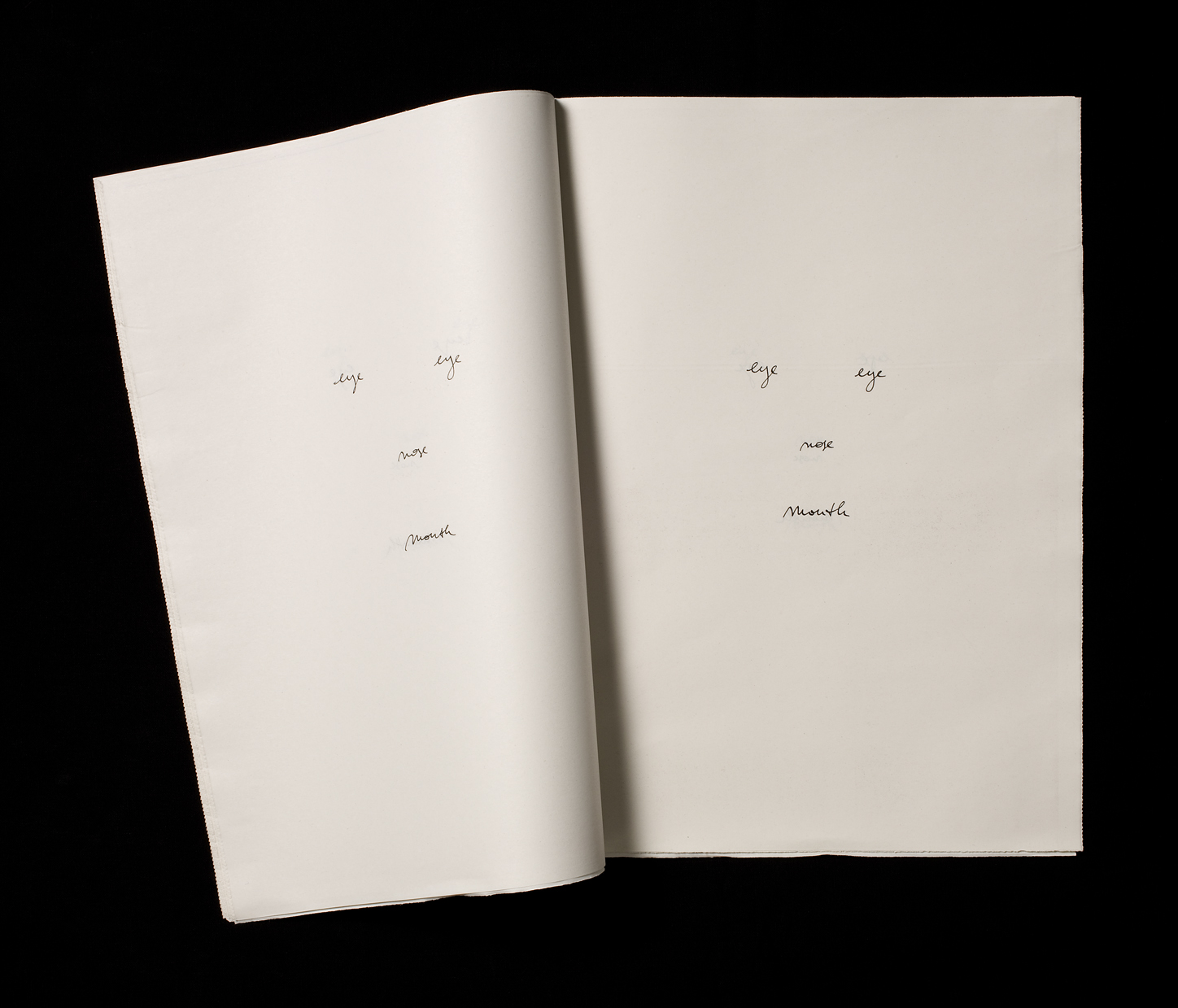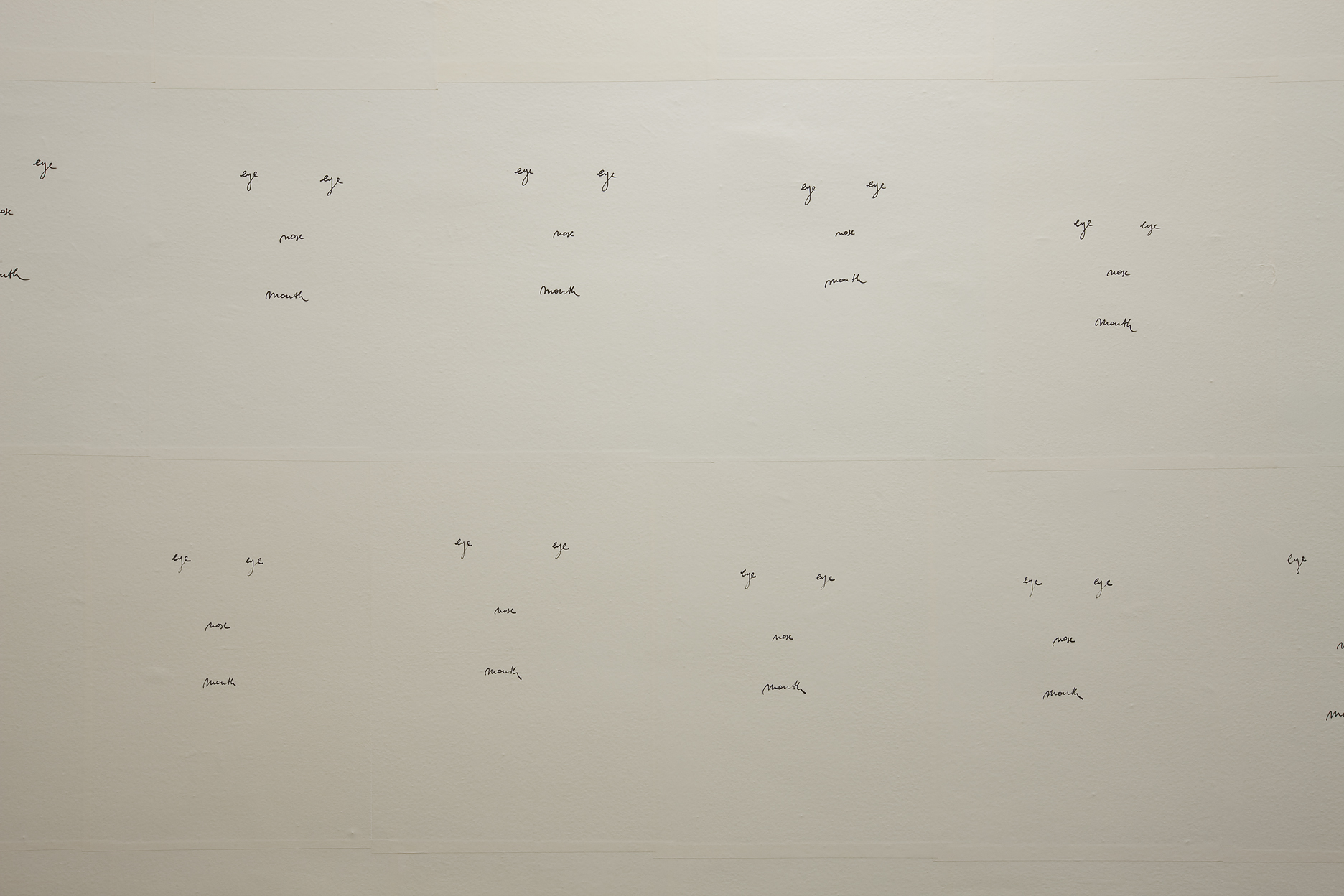 Nel secondo ambiente lo spettatore è completamente immerso in una sorta di ritratto collettivo del genere umano. Decine e decine di disegni all’apparenza identici ma in realtà tutti diversi richiamano la generica fisionomia di un volto umano, attraverso l’utilizzo del linguaggio scritto nel suo valore di immagine e di tautologia. Anche in questo caso la riflessione sull’esistenza come destino collettivo prende le sembianze di un gioco formale sospeso tra stupore e ironia. L’ultima sala vede invece protagonista un’installazione sonora in cui una voce femminile sussurra una domanda banale eppure vitale nella sua quotidianità, una domanda che tutti facciamo per poterci orientare nello spazio e nel tempo e alla quale una voce maschile risponde con un invito al silenzio.