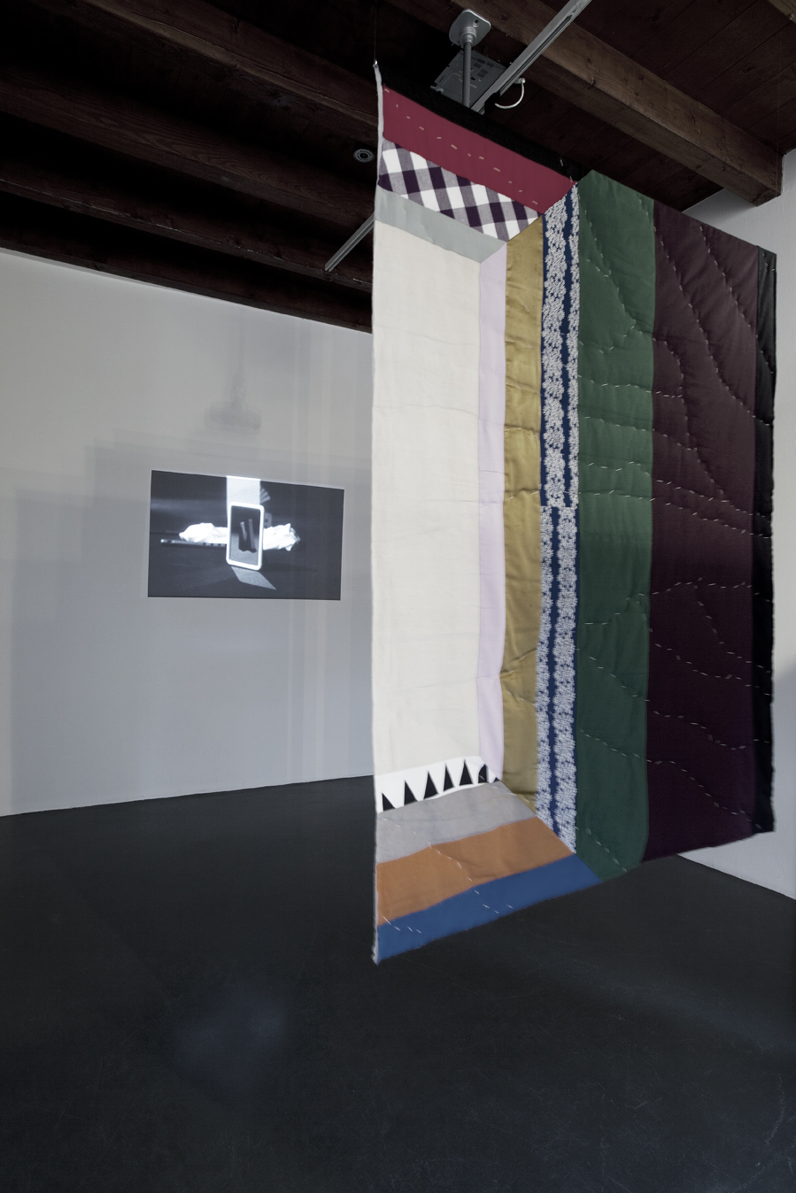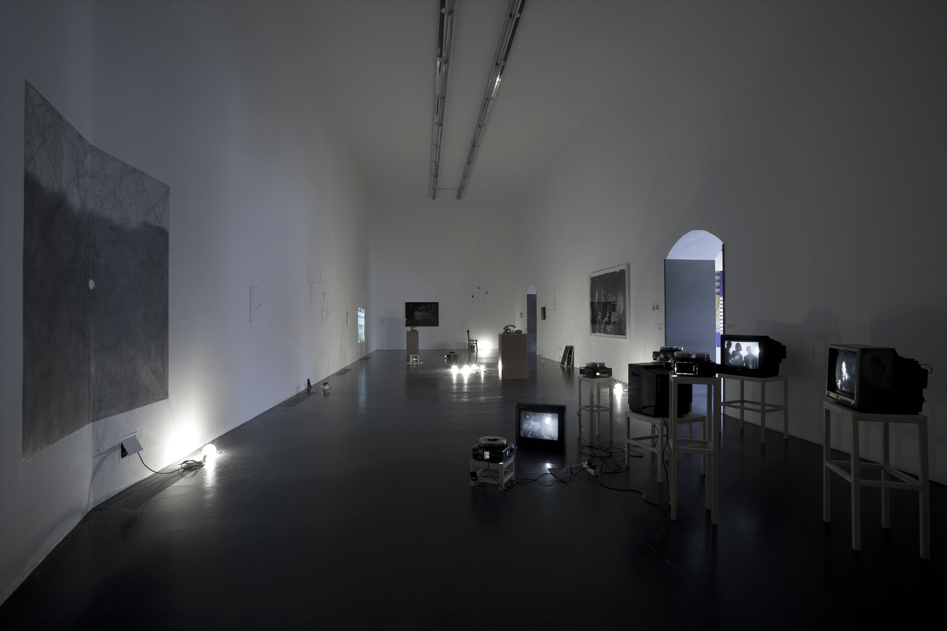 Nello spazio espositivo i lavori dialogano tra loro in una condizione di relativa oscurità, interrotta di tanto in tanto dalla luce prodotta da diverse sorgenti – artificiale, naturale o proveniente dalle opere stesse. Questo ambiente in dissolvenza offre l’opportunità di stabilire delle associazioni tra opere che, sebbene diverse da un punto di vista formale, rivelano strette connessioni l’una con l’altra.