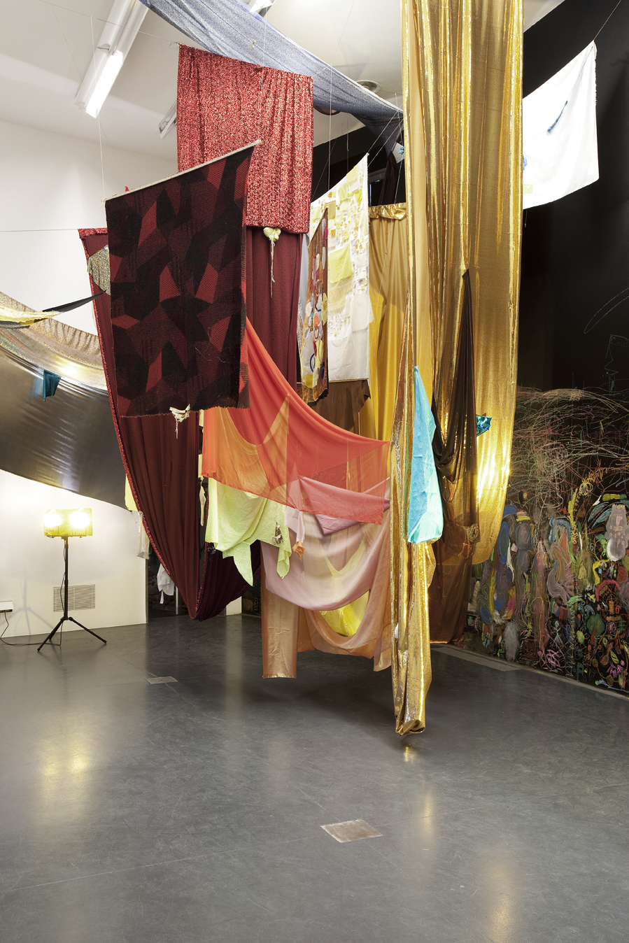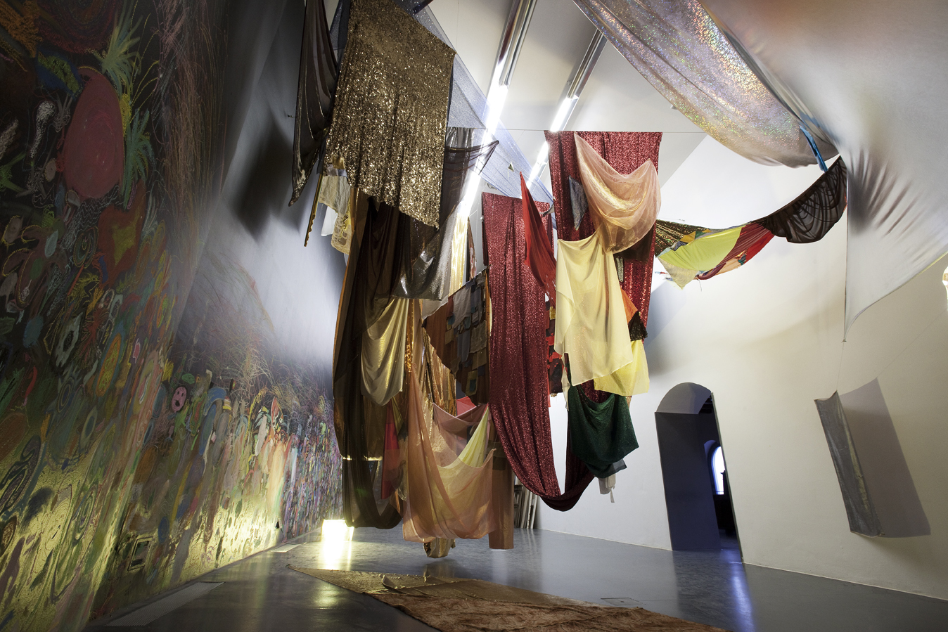 Un INTERVENTO SPAZIALE accoglie il visitatore all’interno della sala espositiva: DRAPPI realizzati con scampoli di stoffa che rappresentano la volta celeste e coniugano magistralmente astrazione e artigianato.