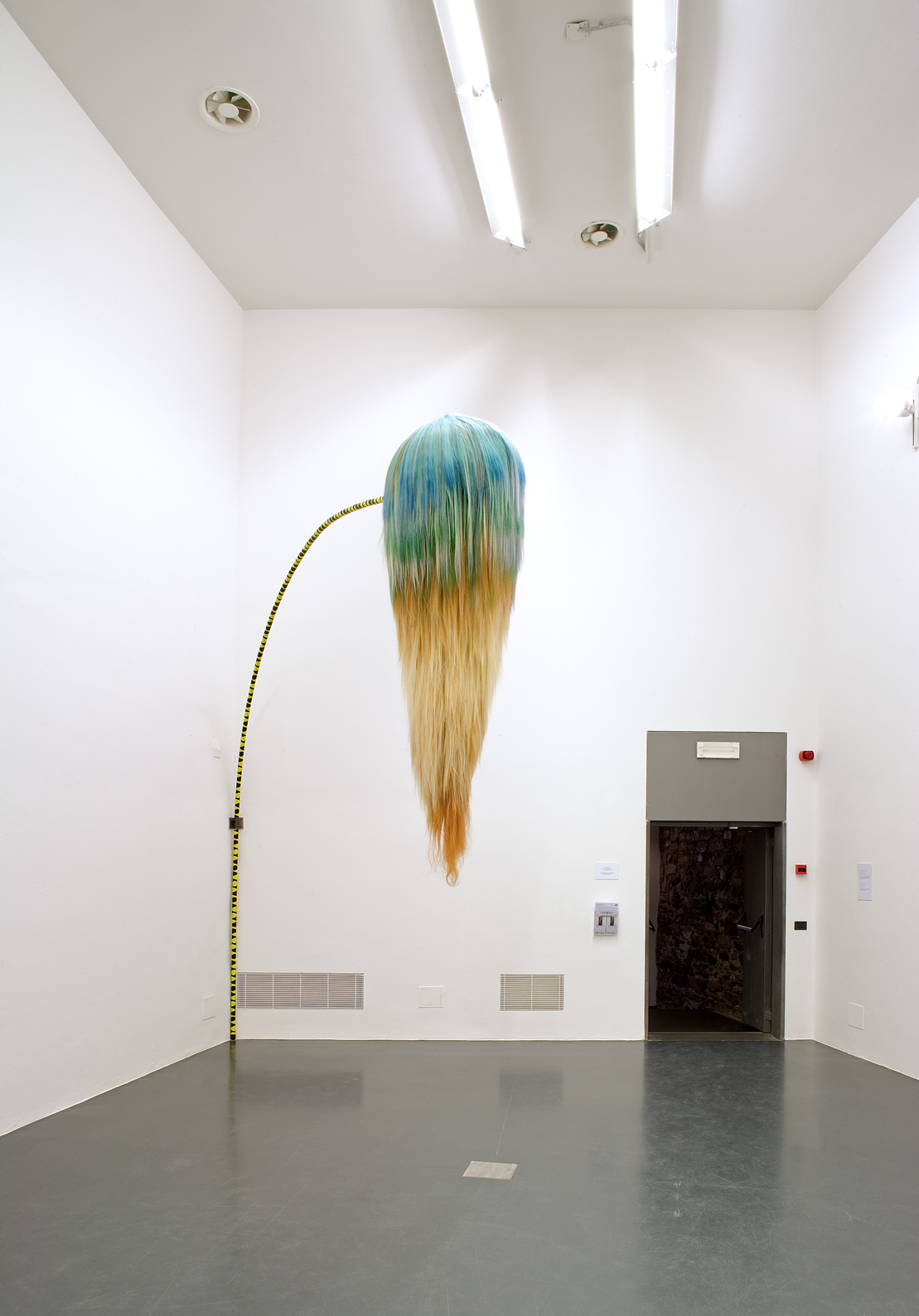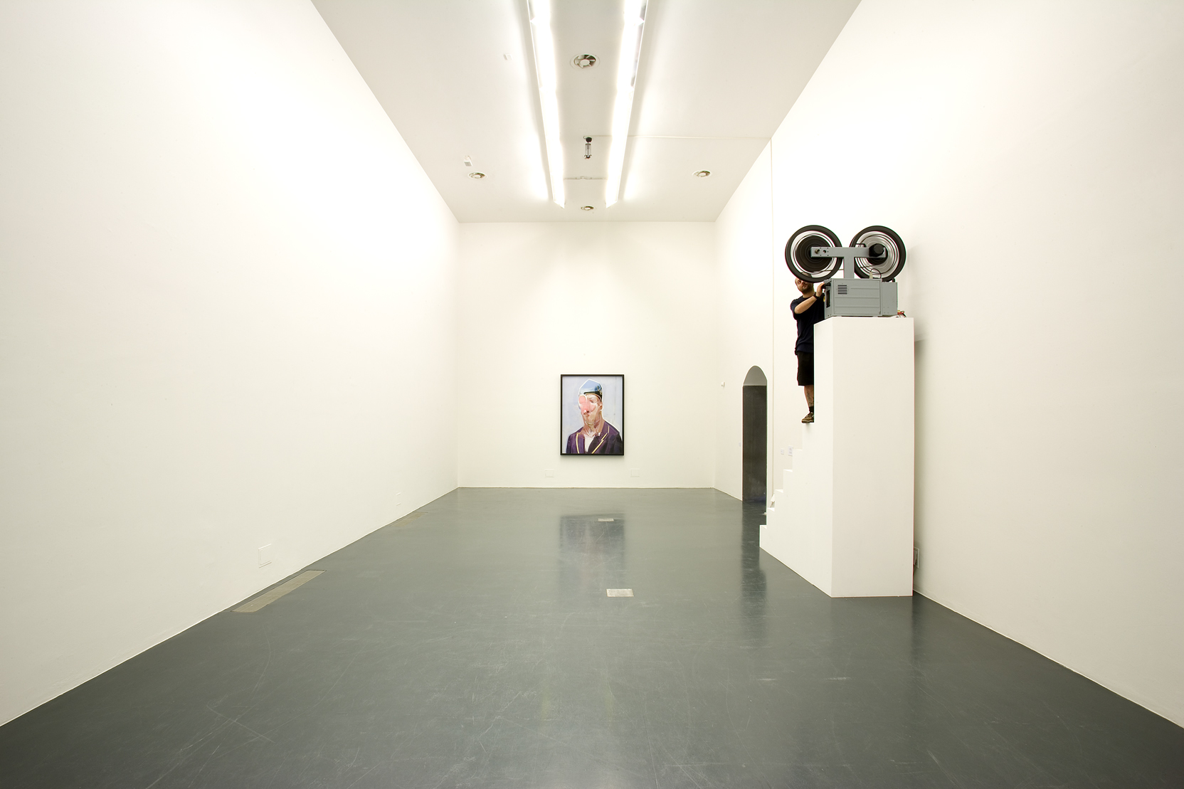 Nello stesso spazio dove è allestito il film, si trovano una scultura e un grande quadro, quasi fossero l’elemento femminile e maschile di una coppia di simulacri che assistono a questa anomala proiezione cinematografica. Entrambi i lavori mettono in scena uno specifico stato di tensione e uno stadio particolare del dinamismo e della metamorfosi. Nel descrivere questa parabola in tre atti, Roccasalva disegna tre diverse configurazioni formali di uno stesso moto: quello ascendente, discendente e rovinoso del contadino nel prologo dell’Andreij Rublëv. A questa figura di Icaro improvvisato, si contrappone l’uomo ritratto nel grande quadro che occupa la parete di fondo dello spazio espositivo: un ascensorista, personaggio ricorrente nell’iconografia dell’artista, figura kafkiana del passaggio e della metamorfosi. La scultura, dal canto suo, evoca il momento di massima tensione di un’asta per il salto in alto, colta anch’essa in una fase di arresto. L’interruzione del movimento causata dallo schianto nel film di Tarkovsky, influenza l’intera “situazione d’opera”, trasformando anche il quadro e la scultura in elementi di un orizzonte sul punto del collasso.